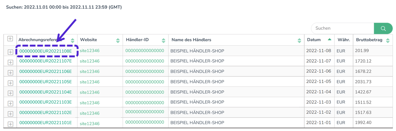 Wenn Sie mehrere Website-Referenzen haben, die der gleichen Händlerkennung (MID) zugeordnet sind, können Sie Ihre Abrechnung in jeder der zugehörigen Website-Referenzen finden.