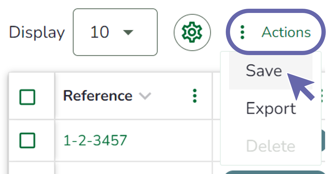 Nachdem die Suche durchgeführt wurde, können Sie die Suchparameter für später speichern, indem Sie die Schaltfläche "Aktionen" oberhalb der Tabelle und dann"Speichern" wählen.