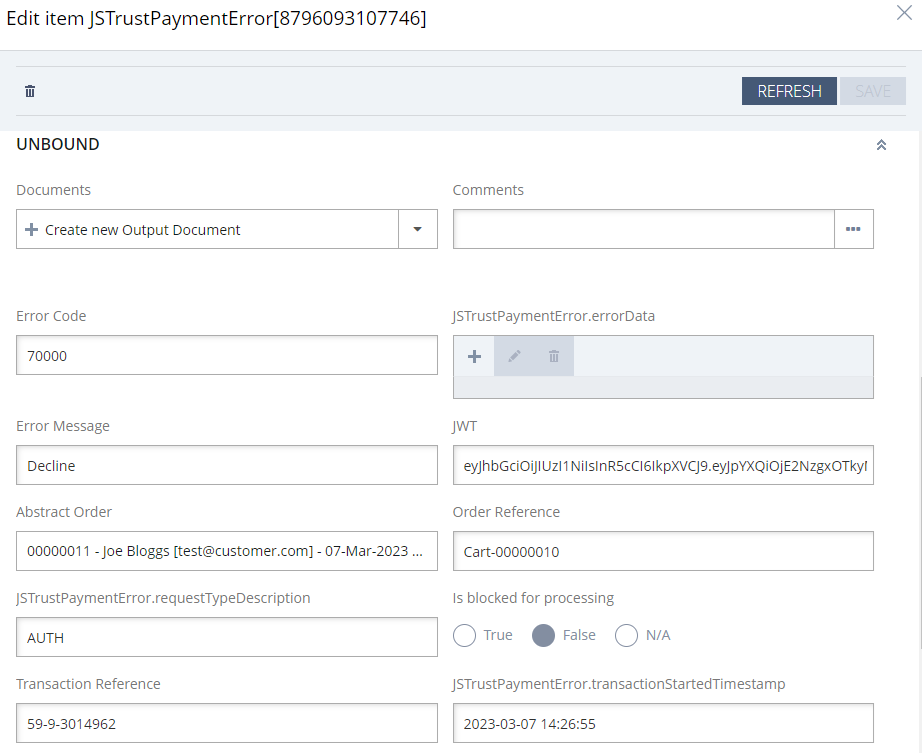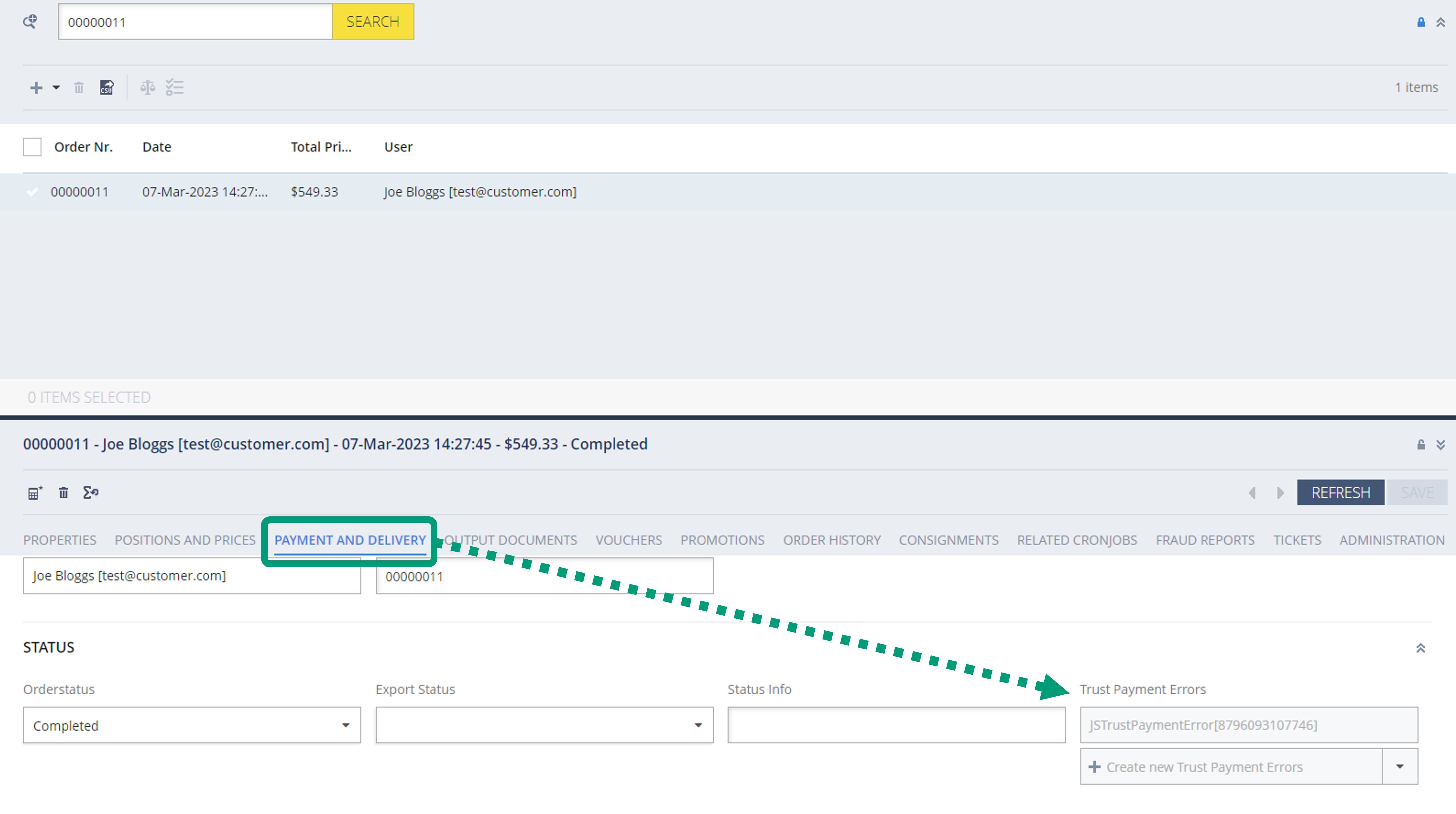 If an error has occurred, an entry will be added to “Trust Payment Errors”, which can be found under the “PAYMENT AND DELIVERY” tab when viewing the order in Backoffice.
