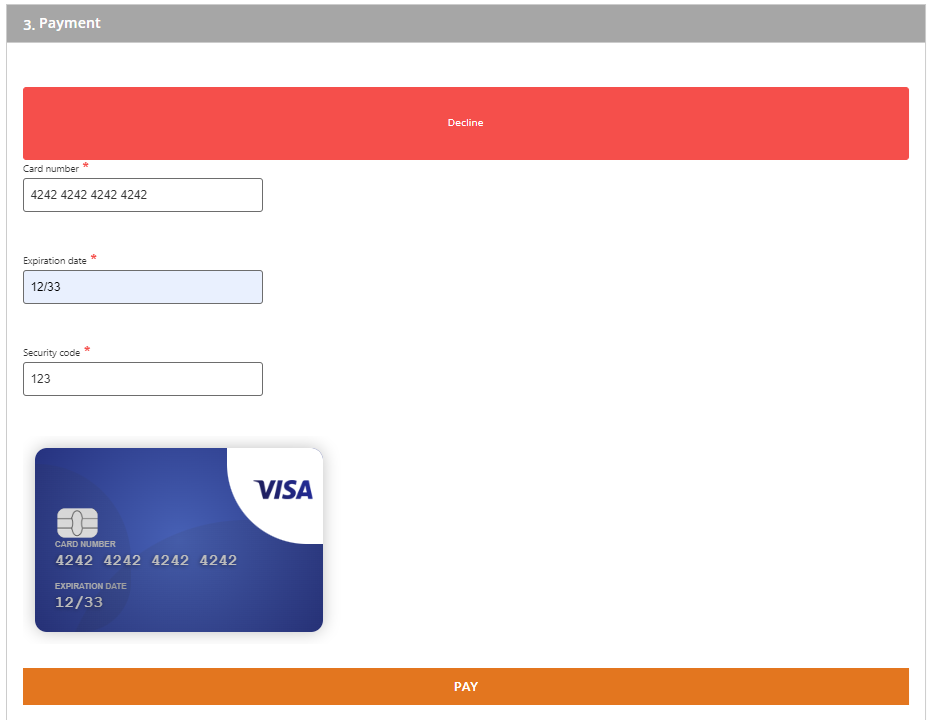 If a card transaction has been declined by the issuing bank, a red "Decline" banner will be shown and the browser will remain on the checkout page, allowing your customer to retry with a different payment method.