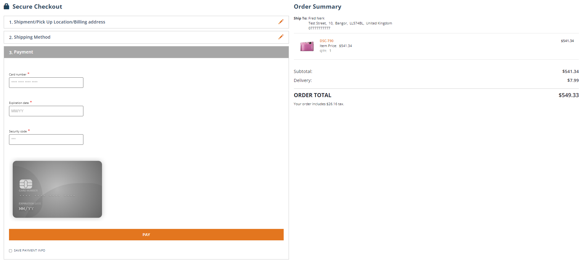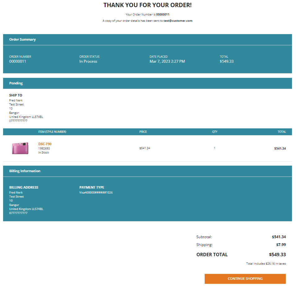 To process a card transaction, fill in the fields displayed and select "PAY". This will process a test transaction using the Trust Payments gateway, TRU Connect, and you will then be redirected to a confirmation page: