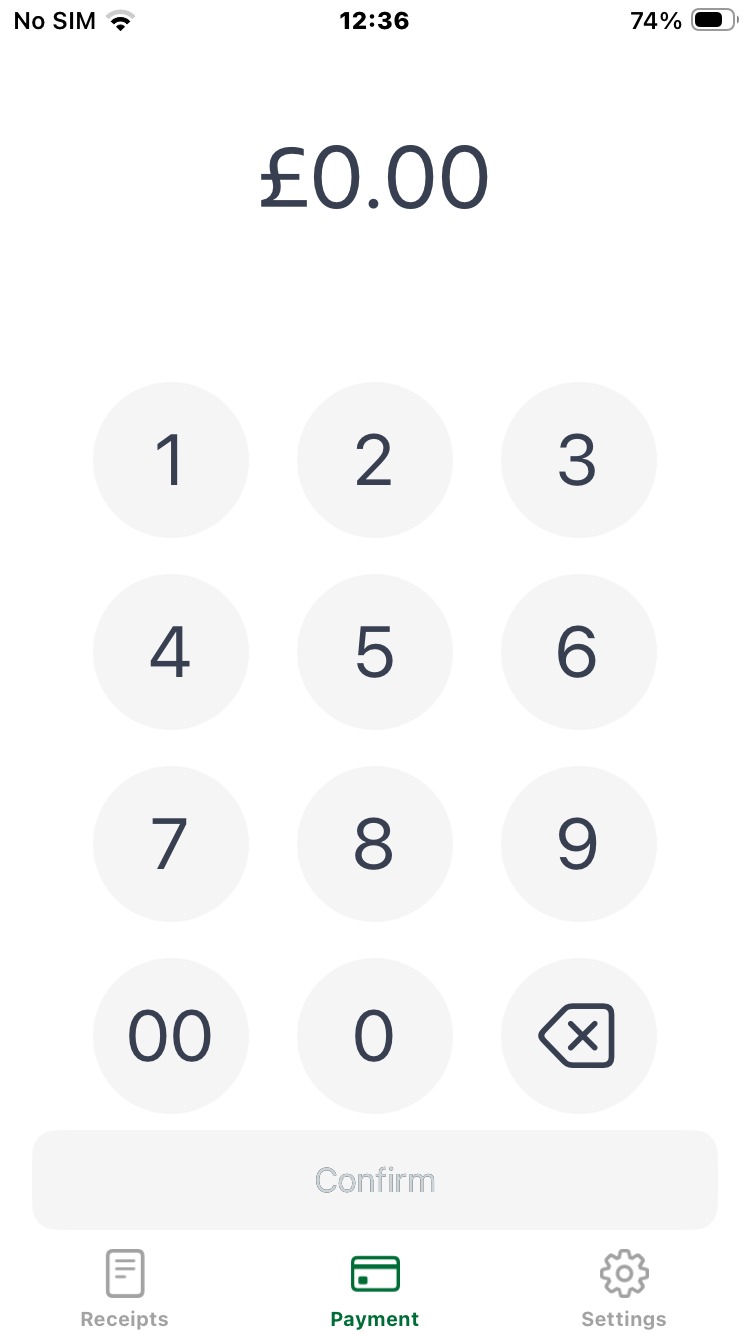 When you open the app, you will be immediately taken to the "Payment" page.