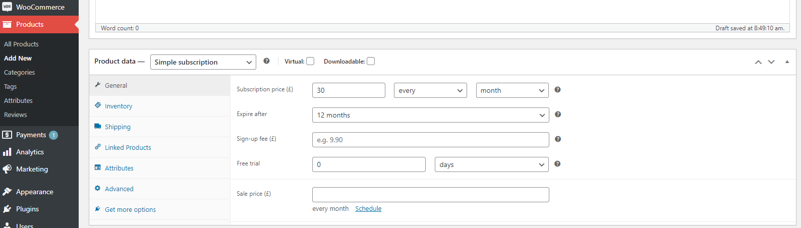 2. Next to the "Product data" heading, select "Simple subscription" from the drop-down.