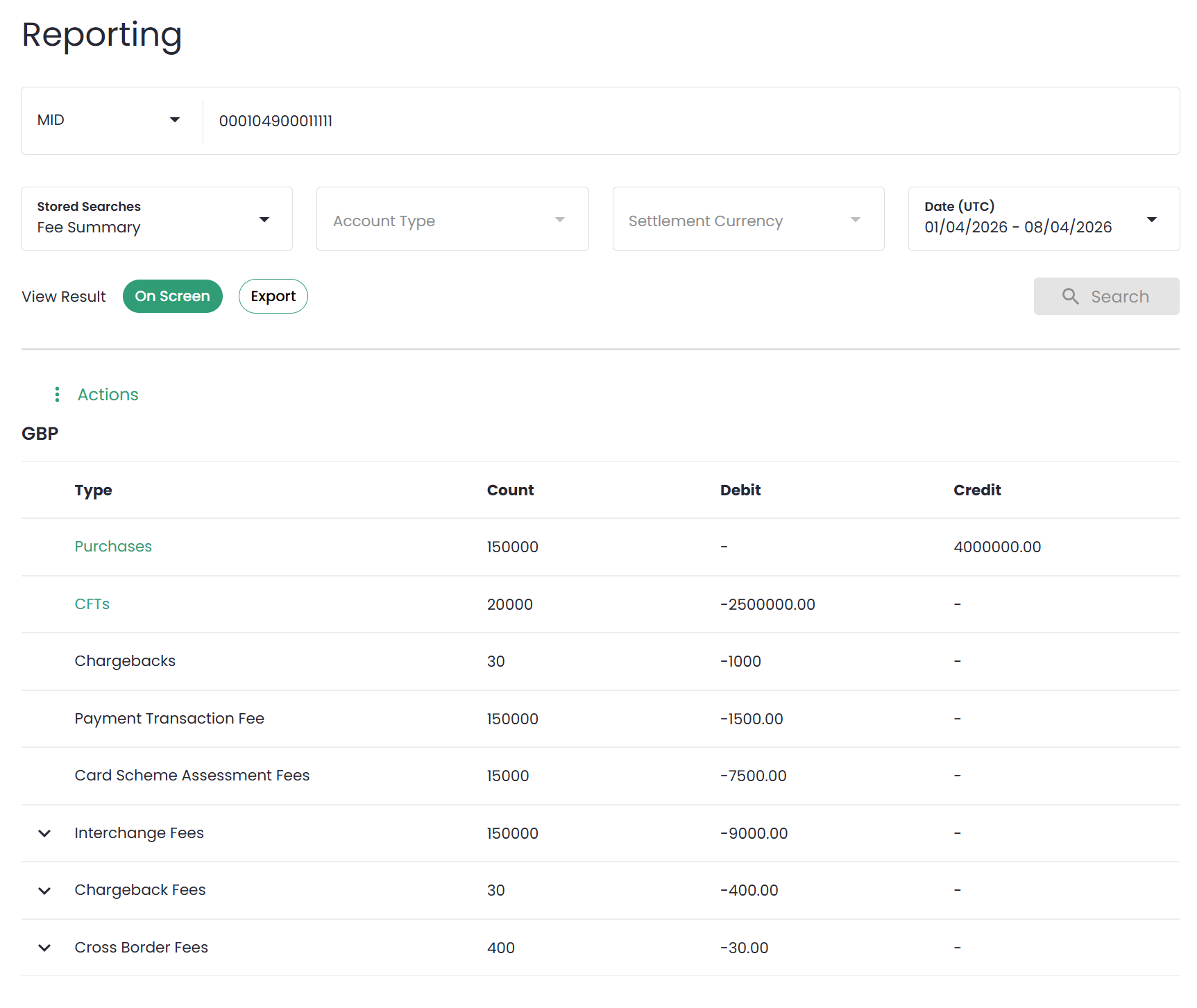 Der Bericht "Gebührenzusammenfassung" bietet eine Übersicht über die Gesamtzahl der Transaktionen, Gebühren, Anpassungen und sonstigen Buchungen, die über das ausgewählte MID in einem Zeitraum von bis zu 31 Tagen verarbeitet wurden.