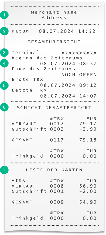 - SCHICHT GESAMTBERICHT - Gesamtzahl und Beträge der kombinierten Verkäufe und Erstattungen. Trinkgelder werden ebenfalls separat ausgewiesen.