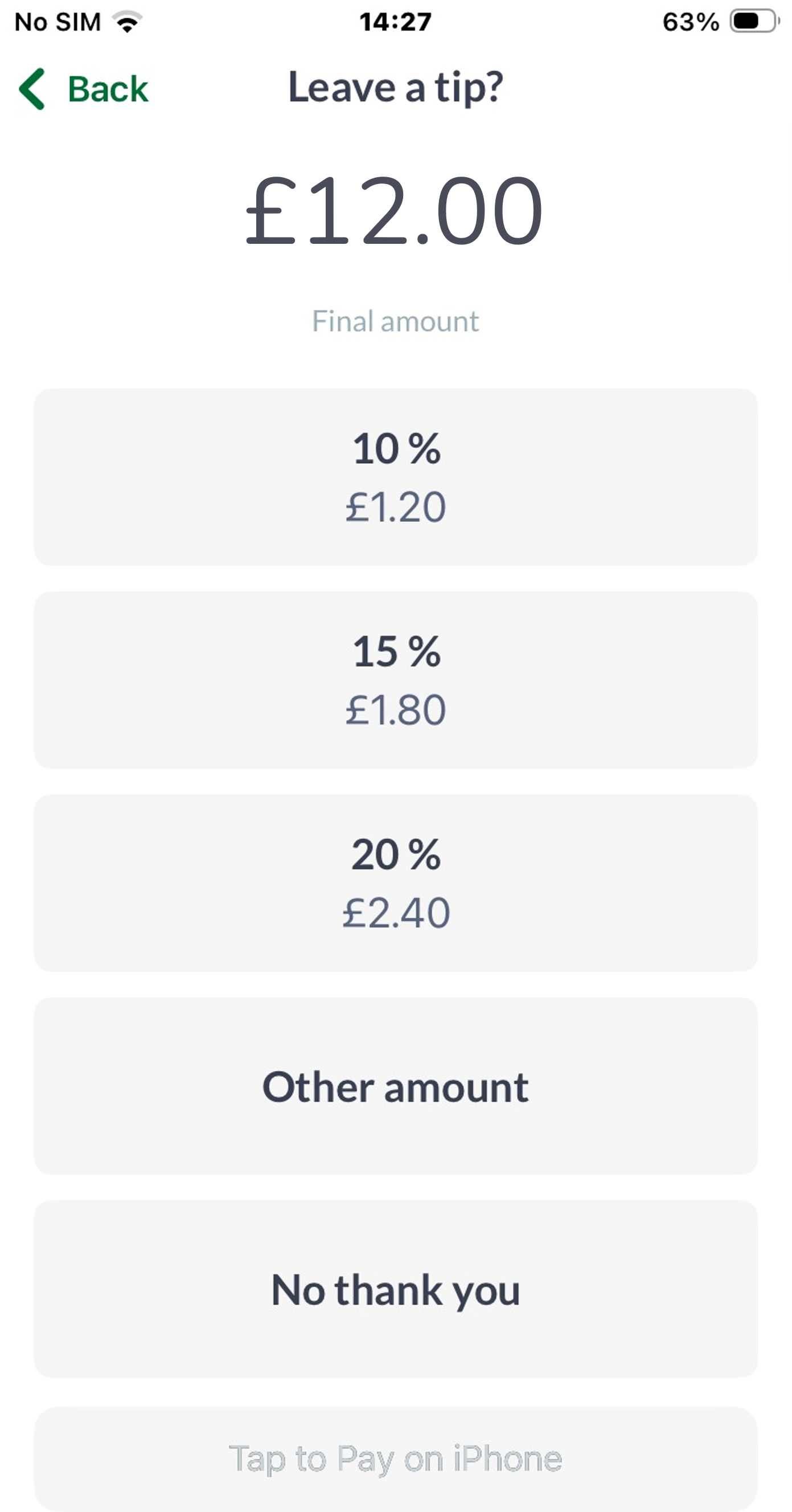 Wenn Trinkgeld in der App aktiviert ist, wird der Kunde vor dem Kauf aufgefordert, aus der vordefinierten Liste der Trinkgeldbeträge auszuwählen (oder er tippt auf „ Anderer Betrag “, um einen benutzerdefinierten Trinkgeldwert einzugeben). Alternativ kann er auf „ Ich verzichte “ tippen, um ohne Trinkgeld zu bezahlen.
