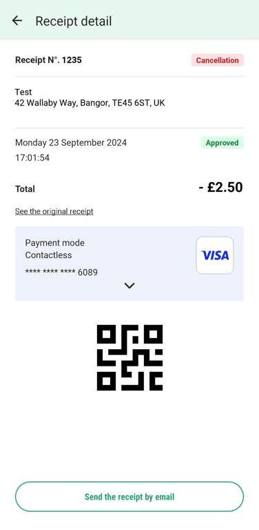 Um die Quittung anzuzeigen, scannen Sie den QR-Code mit einem anderen Smartphone oder tippen Sie alternativ auf"Quittung per E-Mail senden" und geben Sie Ihre E-Mail-Adresse ein.