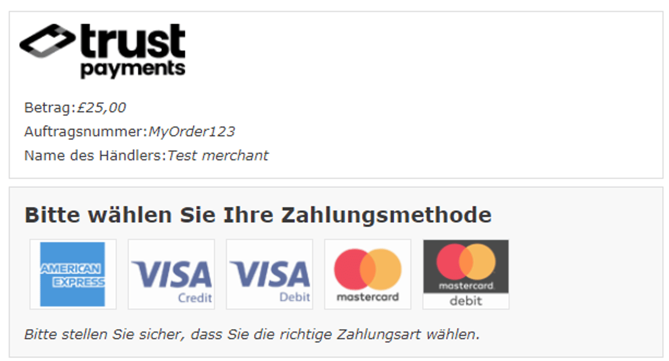 Seite auswählen: Das Logo von Trust Payments wird oben angezeigt, gefolgt von Betrag, Auftragsnummer, Name des Händlers und Zahlungsmethode.