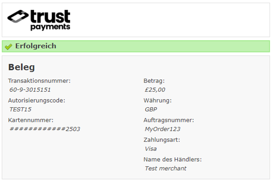 Antwortseite mit Erfolgsmeldung, Transaktions-/Auftragsnummer, Autorisierungscode, maskierte Kartennummer/-typ, Betrag, Name des Händlers.