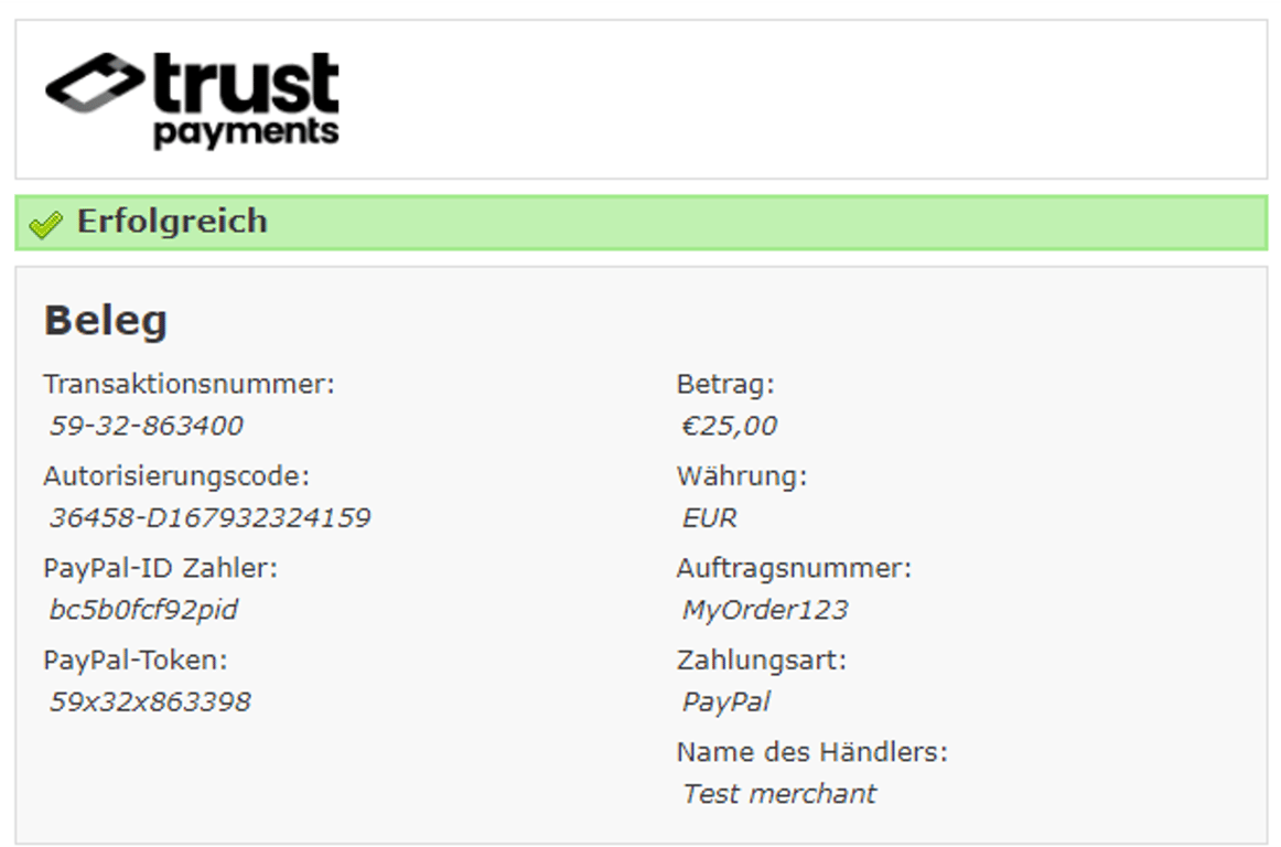 Antwortseite mit Firmenlogo, Erfolgsmeldung, Transaktions-/Acquirer-/Bestellnummer, Betrag, Zahlungsart, Name des Händlers.