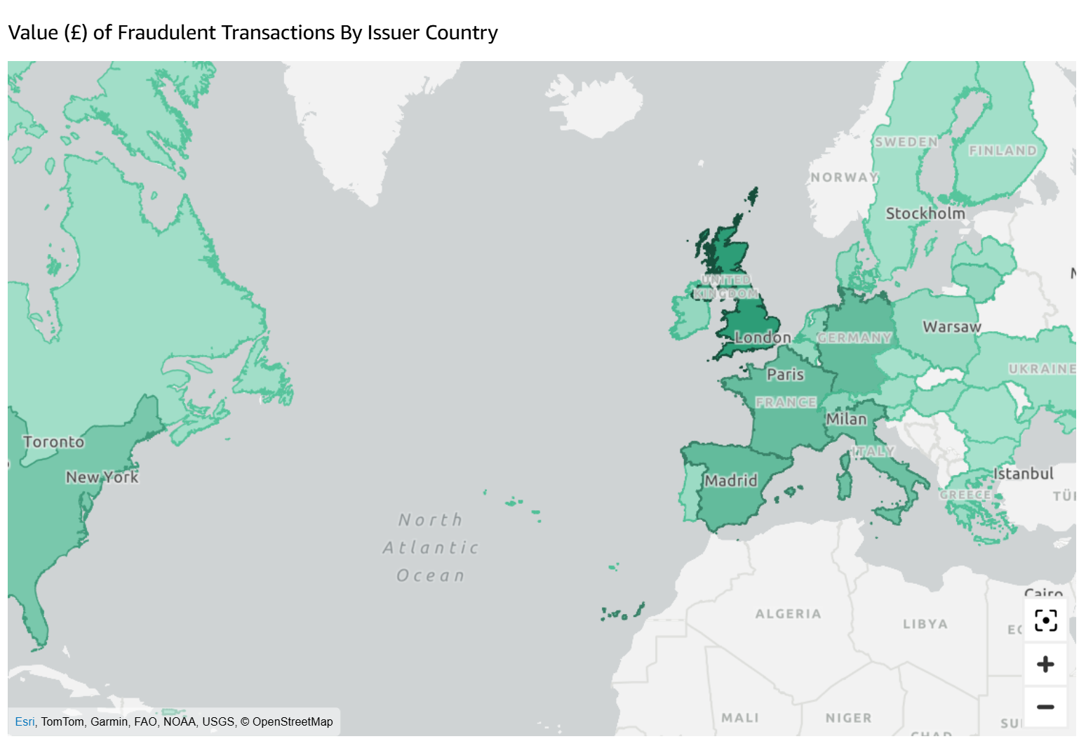 Diese Weltkarte zeigt die Betrugsraten nach kartenausgebenden Ländern durch farbliche Schattierungen an, so dass Sie Regionen mit hohem Risiko erkennen und Ihre Betrugsprävention entsprechend ausrichten können: