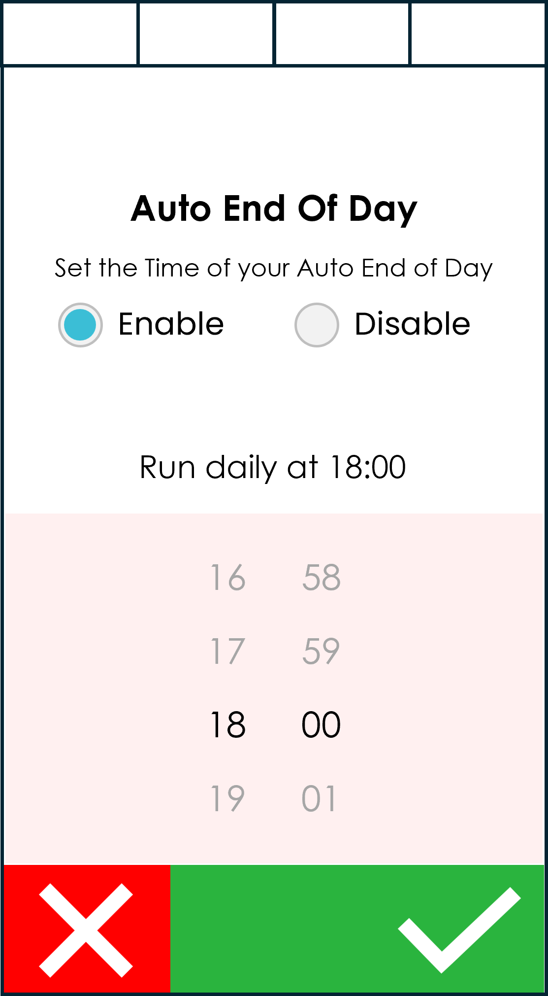 Mit „Auto End of Day“ können Sie einen Tagesabschlussbericht so einrichten, dass er täglich automatisch gedruckt wird, was die Abstimmung erleichtert.