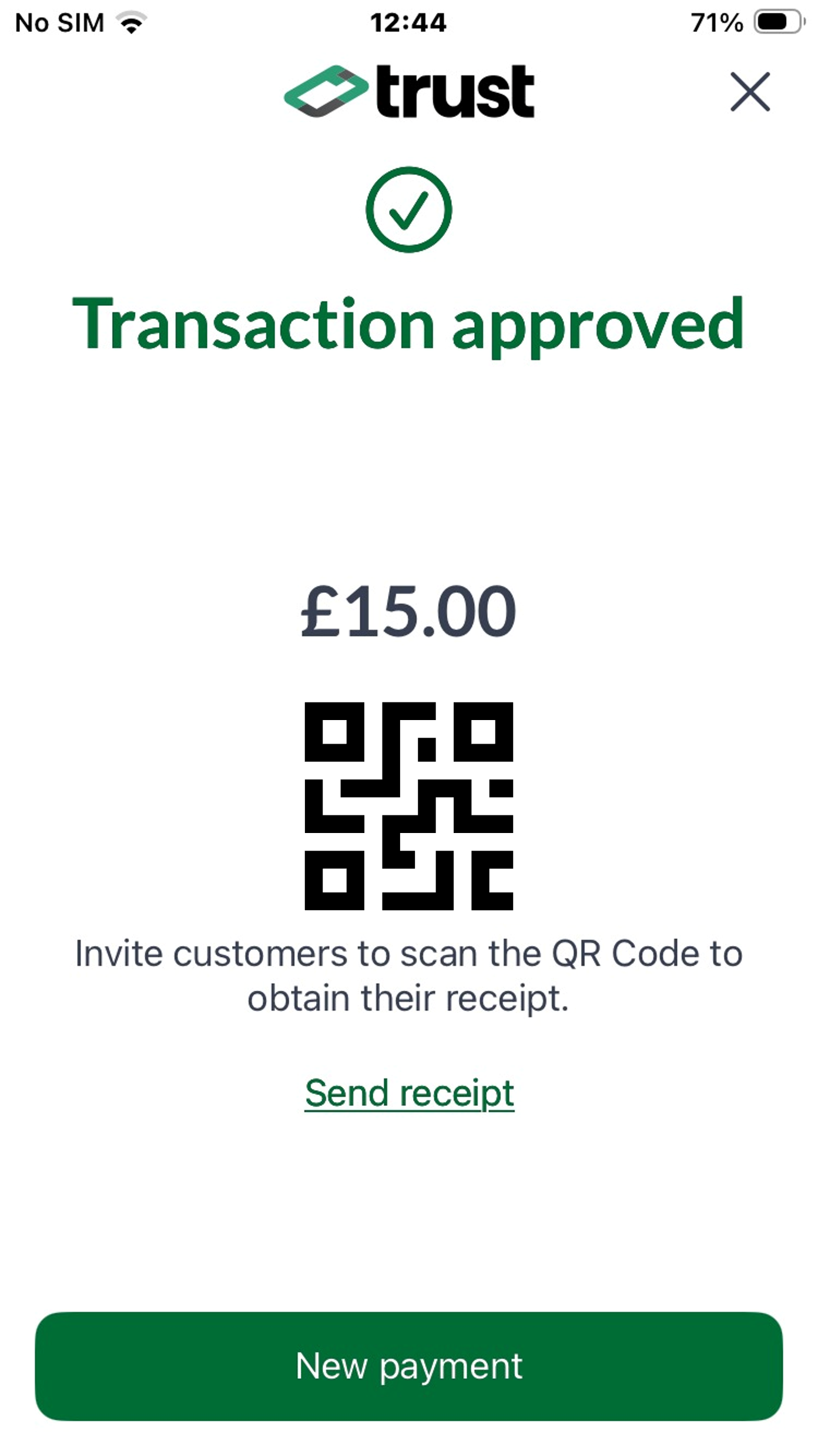 7. Wenn die Autorisierung erfolgreich war, wird dem Kunden die folgende Bestätigungsmeldung angezeigt. Er kann den QR-Code mit seinem eigenen Smartphone scannen, um den Beleg einzusehen, oder alternativ auf"Beleg per E-Mail senden" tippen und seine E-Mail-Adresse eingeben.