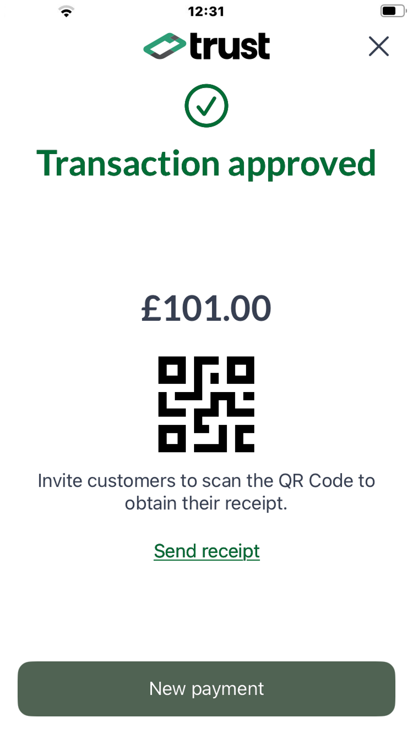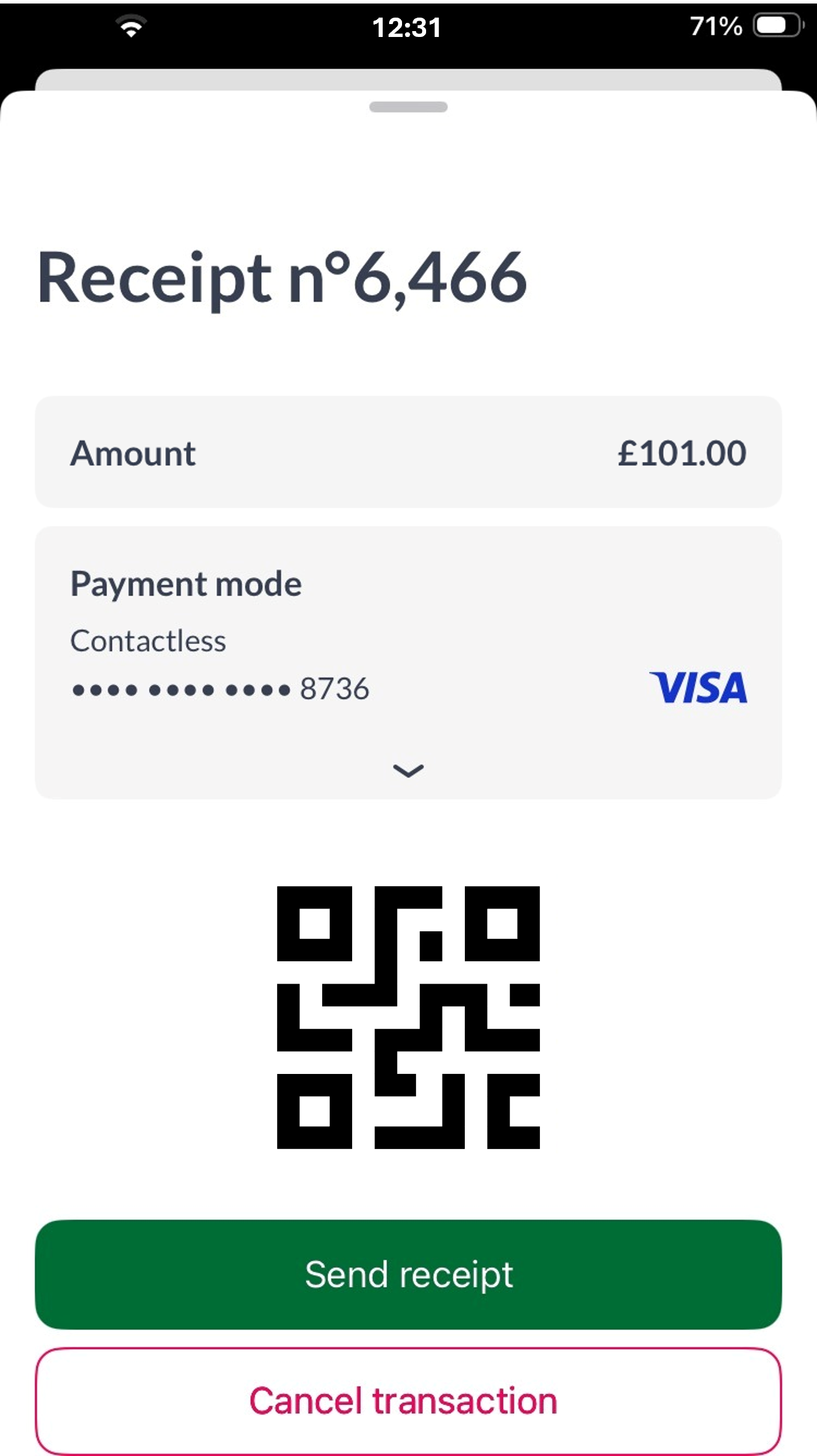 Bei Erfolg wird eine Bestätigung auf dem Bildschirm angezeigt (siehe unten). Kunden können den QR-Code mit ihrem eigenen Smartphone scannen, um die Quittung anzuzeigen, oder alternativ auf"Quittung per E-Mail senden" tippen und ihre E-Mail-Adresse eingeben. Erfahren Sie mehr über Quittungen.
