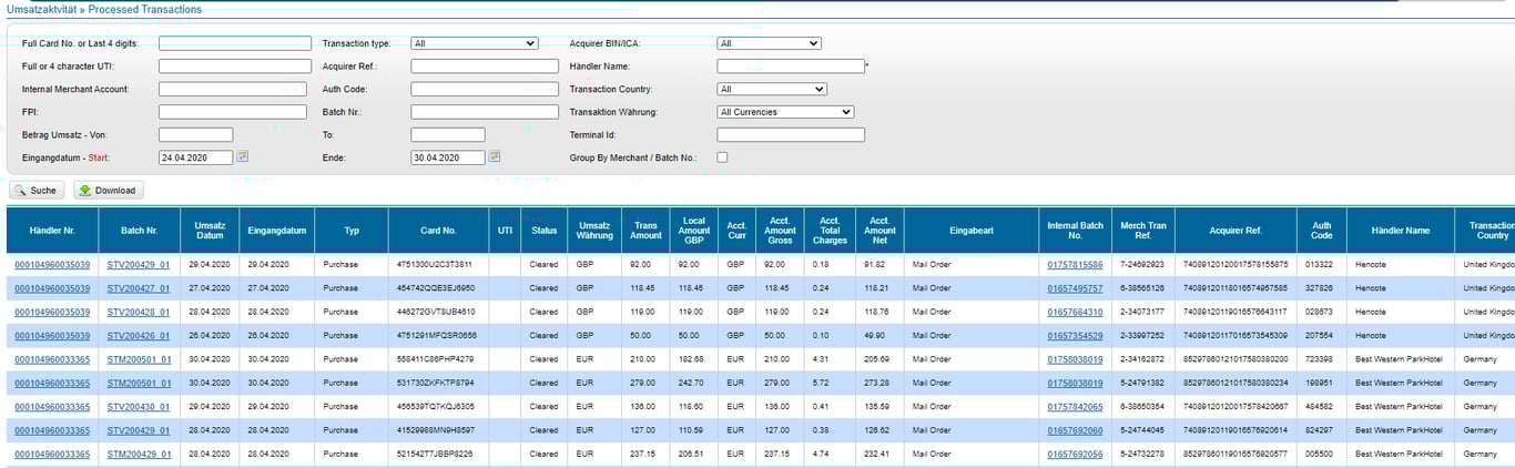 Die Seite „Processed Transactions“ verhält sich wie eine Kombination der Seiten „Processed Batches“ und „Processed Batch Detail“. Die Seite „Processed Transactions“ können Sie verwenden, um alle verarbeiteten Transaktionen für alle Händler innerhalb der Händler-Gruppe oder für einen bestimmten Händler anzuzeigen. Die Suche kann auch auf eine bestimmte Kartennummer, eine Transaktionsart, eine Acquirer-BIN, eine Acquirer-Referenznummer, einen Autorisierungscode, ein Transaktionsland, eine Transaktionswährung, einen Fee Program Identifier eines Kartennetzwerkes, eine Batch-Nummer, einen Transaktionsbetragsbereich und einen bestimmten Buchungsdatumsbereich beschränkt werden. Die Seite „Processed Transactions“ sortiert Ergebnisse immer nach: Vertragshändlernummer und Buchungsdatum. Der Bericht kann bis zu 100 Transaktionen pro Seite anzeigen (scrollen).