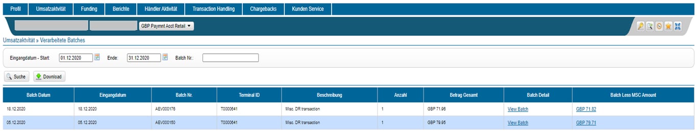 Die Seite „Verarbeitete Batches“ zeigt das eingereichte Batch bzw. die Batches für einen bestimmten Händler oder eine Händler-Gruppe/-Untergruppe innerhalb eines ausgewählten Buchungsdatumsbereichs an. Der Datumsbereich ist auf 31 Tage begrenzt, um eine einheitliche Performance zu gewährleisten. Suchen anhand einer bestimmten Batch-Nummer sind auch möglich.