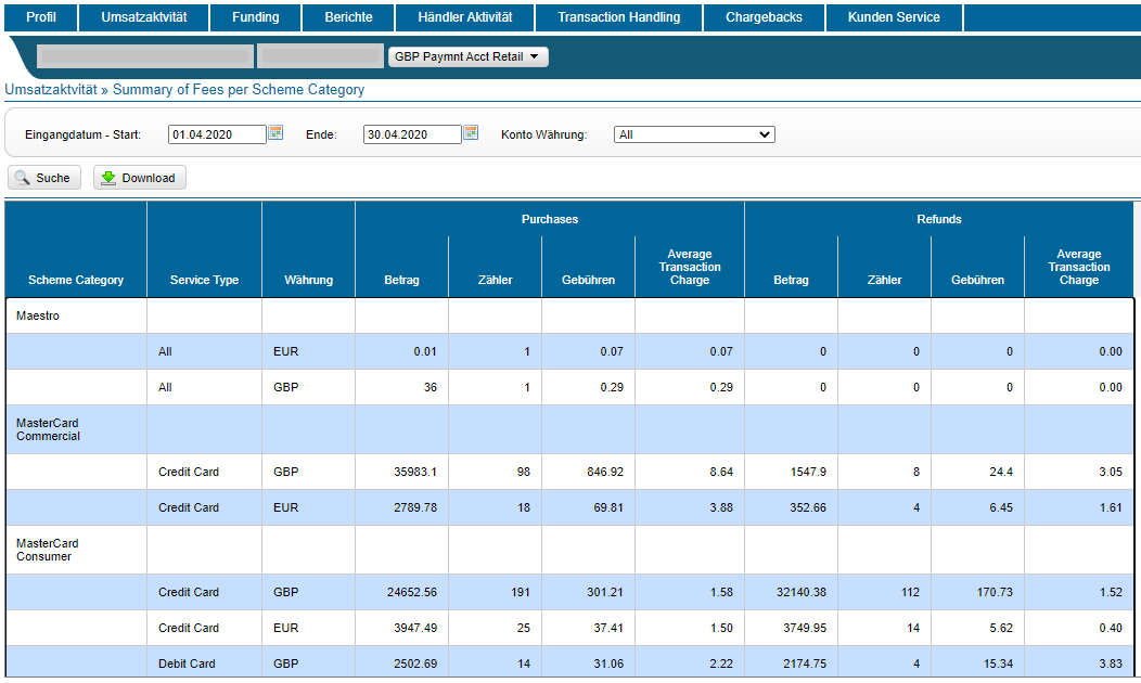 Die Seite „Summary of Fees per Scheme Category“ fasst die berechneten Gebühren nach Kategorie, Servicetyp und Kontowährung zusammen. Standardmäßig zeigt die Seite eine Zusammenfassung der Transaktionsgebühren an, die dem Händler für das aktuelle Buchungsdatum und für alle Ein- und Auszahlungswährungen berechnet wurden.