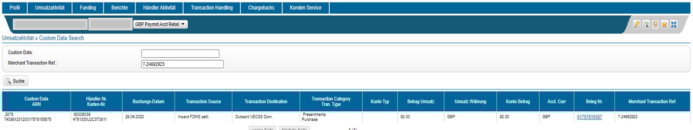 Eingangdatum – Start: Ende | Die Suche kann für einen Buchungsdatumsbereich durchgeführt werden. Hierfür muss ein Datumsbereich eingegeben werden. Für „All Merchants“ ist der Datumsbereich auf 1 Tag beschränkt, für einen bestimmten Händler auf 7 Tage. |