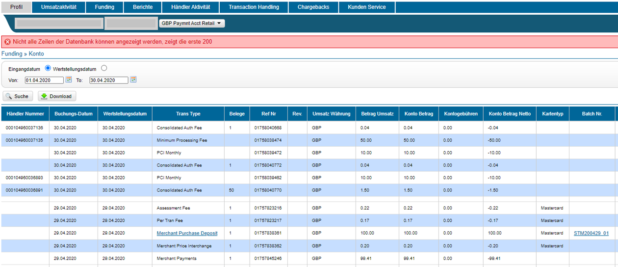 Die Seite „Konto“ zeigt Buchungen auf den Konten des Händlers für einen bestimmten Buchungsdatumsbereich an. Alle monetären Posten, die ein oder mehrere Konten des Händlers betreffen, können über diese Seite angezeigt werden. Um einheitliche Reaktionszeiten zu gewährleisten, ist die Anzahl der von dieser Seite gelieferten Zeilen auf maximal 200 begrenzt. Wenn mehr als 200 Zeilen verfügbar sind, wird die Nachricht „Nicht alle Zeilen der Datenbank können angezeigt werden, zeigt die erste 200“ eingeblendet. In der CSV-Datei ist die Anzahl der Zeilen jedoch nicht begrenzt. Indem Sie diese also herunterladen, stellen Sie sicher, dass alle Daten angezeigt werden.