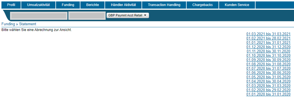 Auf der Seite Kontoauszugsauswahl können Sie Kontoauszüge von Händlern anzeigen. Auf der Seite "Kontoauszugsauswahl" wird eine Reihe von Daten angezeigt, aus denen Sie den Zeitraum auswählen können. Wenn Sie den Hyperlink auswählen, gelangen Sie zur Seite Auszugsdetails. Der Auszug wird automatisch am Ende eines jeden Kalendermonats erstellt.
