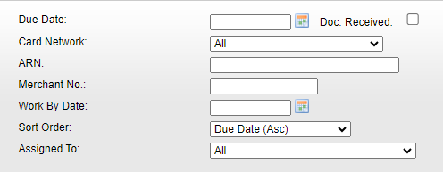 Händler Nr. Filter nach Kundennummer (interne Händlernummer) oder externe Händlernummer. Vollständige oder 4-stellige Kartennummer Nach Kartennummer filtern. Work By Date Filtern Sie nach dem Arbeitsdatum, dem Datum, bis zu dem ein Fall bearbeitet werden sollte. Ergebnisse begrenzen Wählen Sie aus der Dropdown-Liste"Ergebnisse begrenzen", um die maximale Anzahl der zurückgegebenen Fälle zu begrenzen. Sortierreihenfolge Wählen Sie aus der Dropdown-Liste"Sortierreihenfolge", um die Reihenfolge festzulegen, in der die Fälle in den Ergebnissen angezeigt werden sollen.