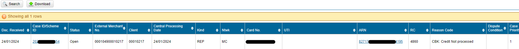 | ARN | Acquirer-Referenznummer. Diese ist zugleich auch ein Link zur Seite „Chargeback Case Detail“. |