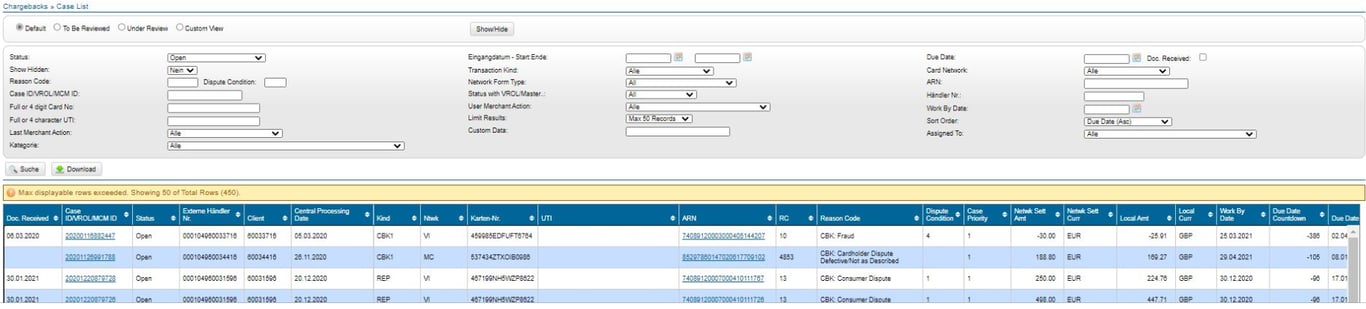Case Id Die eindeutige Kennung des Falls, die vom OmniPay-System zugewiesen wird. Diese ist zugleich auch ein Link zur Seite „Chargeback Case Detail“.