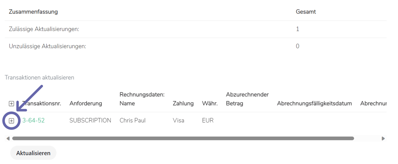 Schritt 2: Wählen Sie auf der Seite "Transaktionen aktualisieren" das Symbol + , um die Felder anzuzeigen, die bearbeitet werden können.