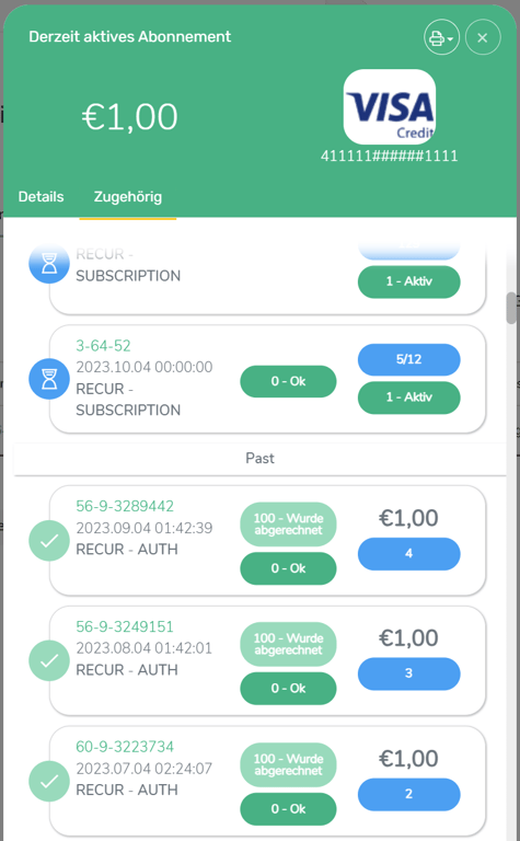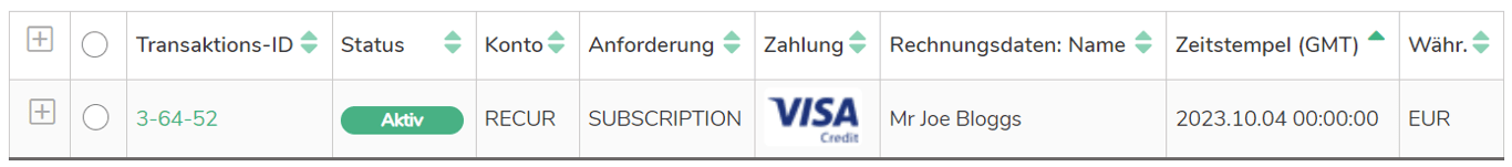 | Derzeit aktiv | Das Abonnement verarbeitet eine Zahlung zu dem im Feld Zeitstempel angegebenen Datum |