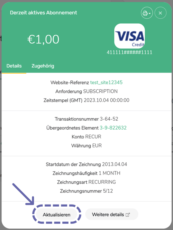 Schaltfläche "Aktualisieren" bei der Anzeige von Abonnementdetails angezeigt