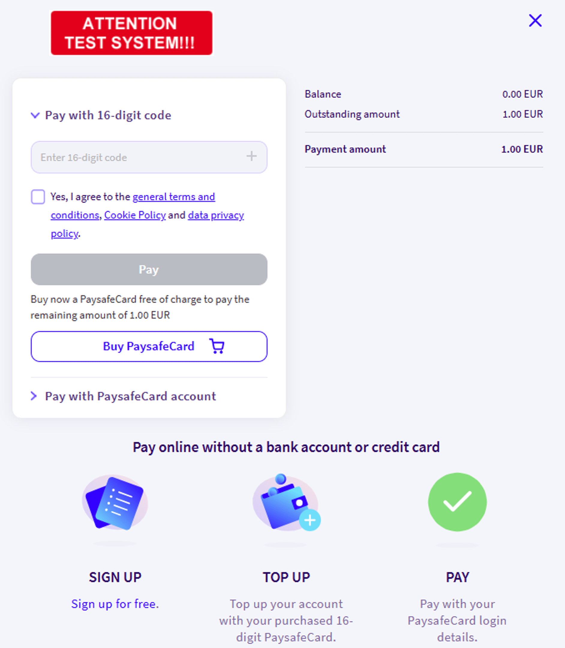 Bei der Durchführung von Testtransaktionen wird Ihr Browser auf die PaysafeCard umgeleitet, um eine Zahlung zu simulieren. Abgesehen davon ist der Prozess genau derselbe wie bei der Verarbeitung von Live-Zahlungen.