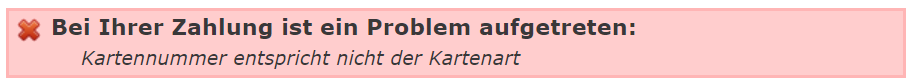 Wenn der Kunde Kartendaten eingibt, die nicht mit dem Kartentyp übereinstimmen, und versucht, eine Zahlung abzuwickeln, wird die Zahlung nicht verarbeitet und eine rote Warnmeldung wird oben auf der Seite angezeigt.
