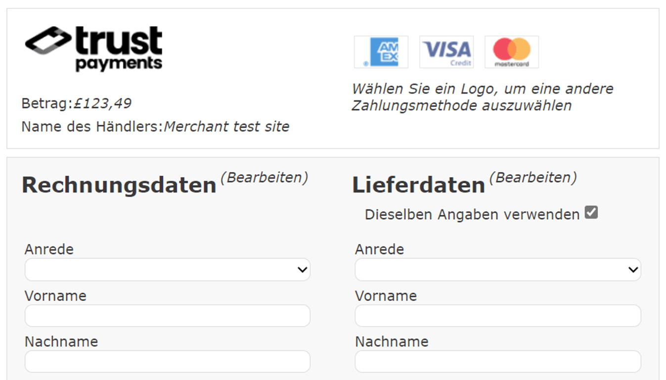 Der Kunde kann auf eine andere Zahlungsart klicken, und die Seite mit den Zahlungsdetails wird erneut angezeigt, mit Feldern und Inhalten, die für die ausgewählte Zahlungsart relevant sind.