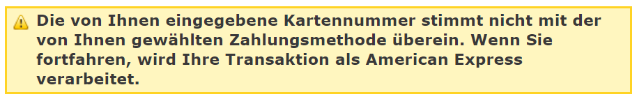Wenn die Kartendaten, die der Kunde eingegeben hat, nicht mit der auf der Zahlungsauswahlseite ausgewählten Kartenart übereinstimmen, wird oben auf der Seite eine gelbe Warnung angezeigt, die darauf hinweist, dass sich die Zahlungsart geändert hat.