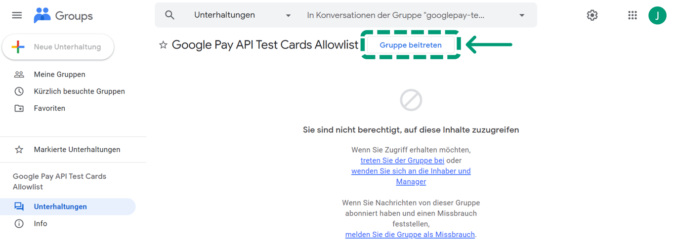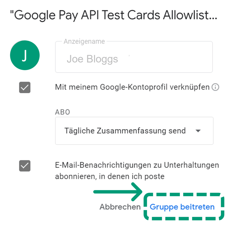 Um mit dem Testen von Google Pay in einer Testumgebung zu beginnen, benötigen Sie ein Google-Konto und müssen einer von Google bereitgestellten Gruppe beitreten, die es Ihnen ermöglicht, eine Reihe von API-Testkarten zum Testen Ihrer Google Pay -Lösung zu verwenden.