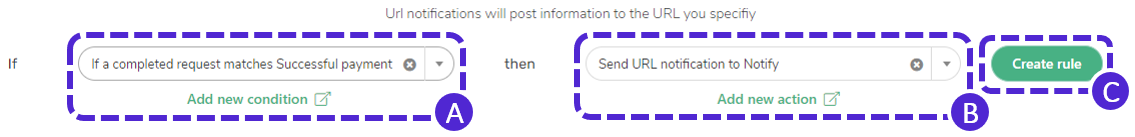 Add new condition(A) Select “Add new condition” and specify the circumstances in which the URL notification is to be triggered following a transaction. Ensure the following options are ticked: