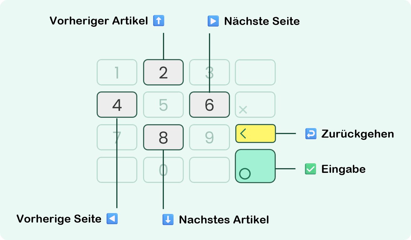 Die Tastatur ist eine alternative Möglichkeit, um durch das Terminal zu navigieren, ohne den Touchscreen verwenden zu müssen. Sie wird auch zur Eingabe von PINs, SSIDs, Passwörtern und anderen alphanumerischen Daten verwendet. Die wichtigsten Funktionstasten werden im Folgenden erläutert.