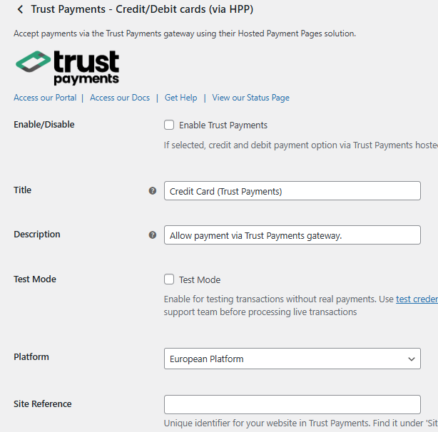 Insert the site reference provided in your Trust Payments Welcome Email. Please use your test site reference (prefixed with "test_") on your staging site and your live site reference on your live site.