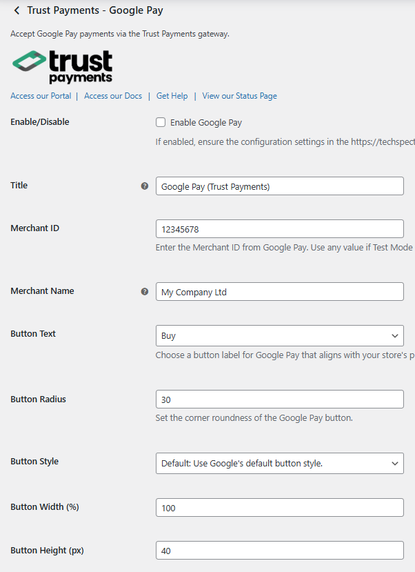 Navigate to WooCommerce > Settings, select the Payments tab, then select Trust Payments - Google Pay.
