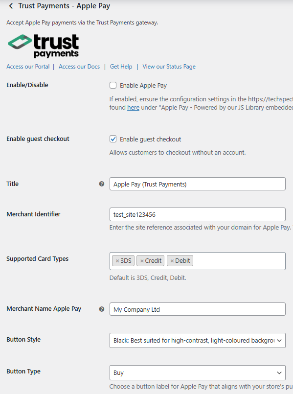 Navigate to WooCommerce > Settings, select the Payments tab, then select Trust Payments - Apple Pay.