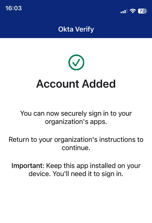 Okta Verify screenshot: Excerpt of text shown: "Account Added. You can now securely sign in to your organization's apps."