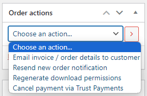 3. When viewing details of the order, on the right of the page, under the "Order actions" heading, select the drop-down box, then select "Cancel payment via Trust Payments", then select the "Update" button that is directly beneath it.